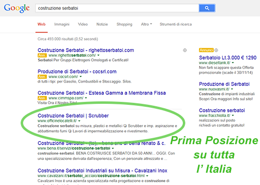 Dopo lo studio relativo alle migliori parole chiave su cui puntare, per avere il maggiore ed il migliore traffico di visite, e il lavoro di posizionamento, attualmente il sito è in primissima posizione, in prima pagina a livello nazionale per la ricerca "costruzione serbatoi", che è proprio l'attività principale dell' azienda, oltre a comparire per molte altre voci relative all' attività in questione.